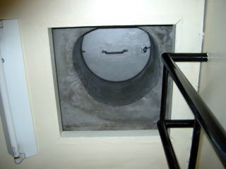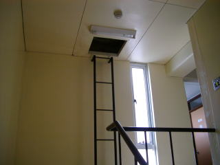 ここは階段を最上階(4階)まで登った所である。階段の踊り場の天井に四角い穴が開いていて、ハシゴが付いている。何を隠そう、これが屋上への「唯一の」出口なのである。
