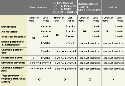 *In addition, final-year undergraduate students may take out up to 10 graduation theses for a period of four weeks. There is also an extended loan service that allows other undergraduate students to take out up to 10 items for the duration of the spring and summer vacation periods.